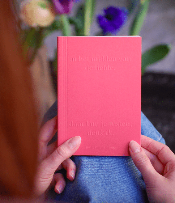 Cover met tekst in blinddruk l binnenwerk met semi-transparante blaadjes, zodat de teksten op de verschillende bladzijden met elkaar communiceren.