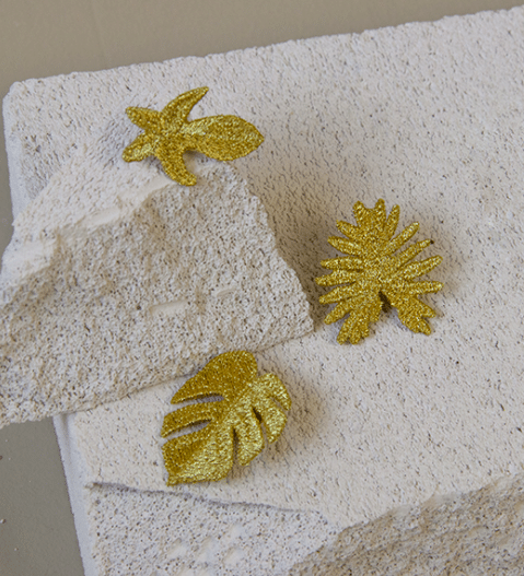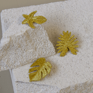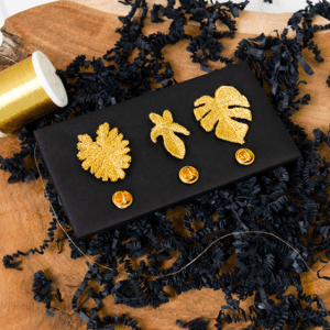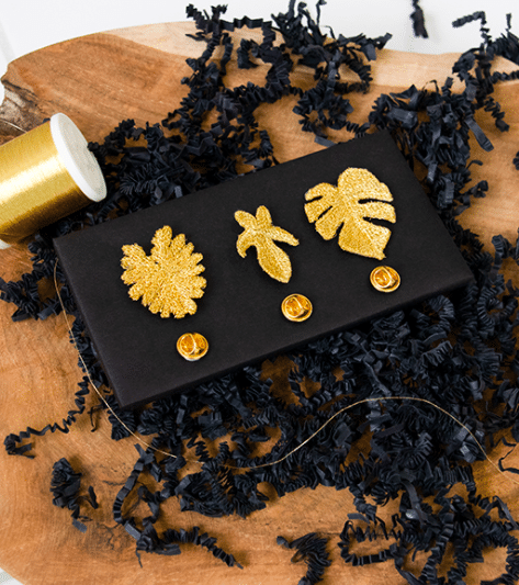 De doos bevat drie verschillende bladeren, elk met een eigen persoonlijkheid. Combineer ze samen voor een groot statement, of voeg er één toe aan een kraag, een hoed of een tas voor een beetje extra stijl.